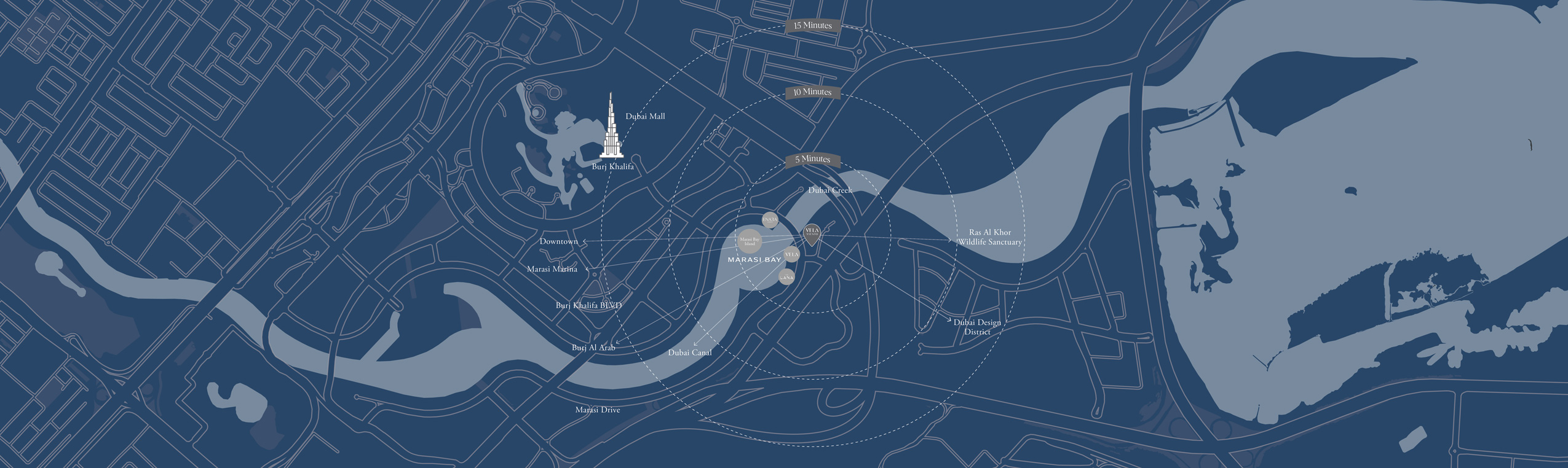 views of Marasi Bay, Burj Khalifa, and Downtown Dubai.